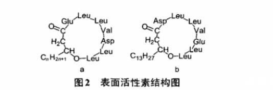 得到的脂肽先由氨基酸自動分析儀獲得脂肽的氨基酸組成,然后用電噴霧四極桿~飛行時間串聯(lián)質(zhì)譜(ESI Q-TOF MS/MS)和氣相色譜/質(zhì)譜連用(GC/MS)對脂肽結(jié)構(gòu)進行解析。
