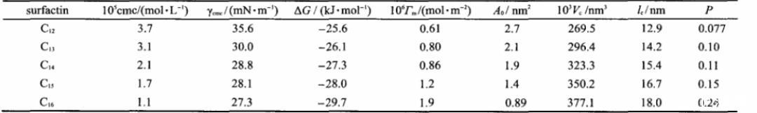由一系列表面活性素溶液表面和界面活性實(shí)驗(yàn)可以看出,隨著表面活性素脂肪鏈長(zhǎng)度的增加,使得表面活性素的表面、界面活性加強(qiáng),更有助于膠束的形成。