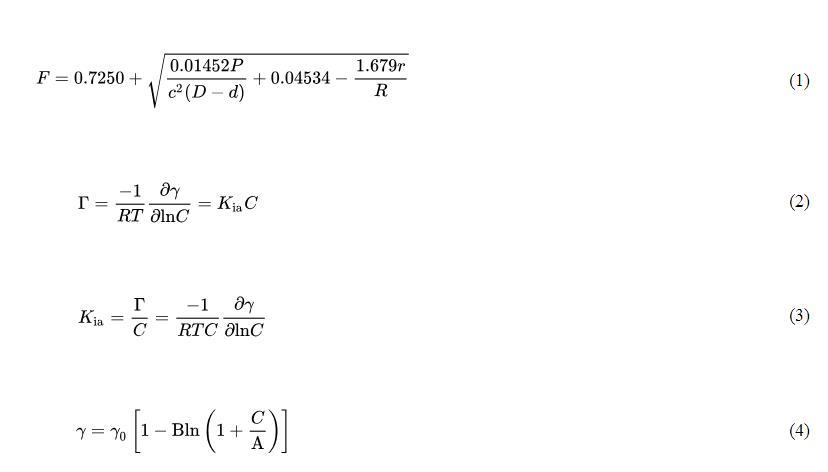 實際表面張力(γ)由儀器表面張力讀數(shù)(P)、校正因子(F)和實驗相關常數(shù)相乘得到。校正因子計算如公式(1)所示;氣-水界面吸附系數(shù)通過Gibbs吸附等溫方程得到,見公式(2)和公式(3);將Szyszkowski方程應用于表面張力數(shù)據(jù),見公式(4),該方程提供了一種計算數(shù)值的統(tǒng)一方法。