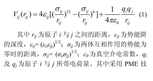 其中,rij為原子i與j之間的距離;εij為勢能阱的深度,εij(εiiεjj)1/2;σij為兩體互相作用的勢能為零時的距離,σij(σiiσjj)1/2;ε0為真空介電常數(shù);qi及qj為原子i與j所帶電荷量。其中采用PME技術(shù)模擬分子間長程庫侖作用力,范德華作用截距設(shè)定為0.9 nm。此外,本文采用諧波勢能函數(shù)模擬鍵拉伸和鍵角彎曲等分子內(nèi)鍵結(jié)作用力。