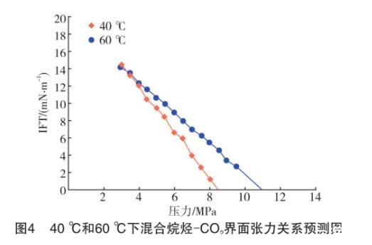 將擬合直線向橫軸方向繼續(xù)延伸,與壓力軸會(huì)有一個(gè)交點(diǎn),該交點(diǎn)的物理意義即界面張力為零時(shí)的壓力大小。根據(jù)CO2的驅(qū)油機(jī)理和最小混相壓力所表現(xiàn)的特征,該點(diǎn)的橫坐標(biāo)值即為實(shí)驗(yàn)對(duì)象在特定溫度下的MMP。表2列出了40℃和60℃下所測(cè)氣液之間的壓力與界面張力的關(guān)系式和相關(guān)系數(shù),以及對(duì)最小混相壓力的預(yù)測(cè)。