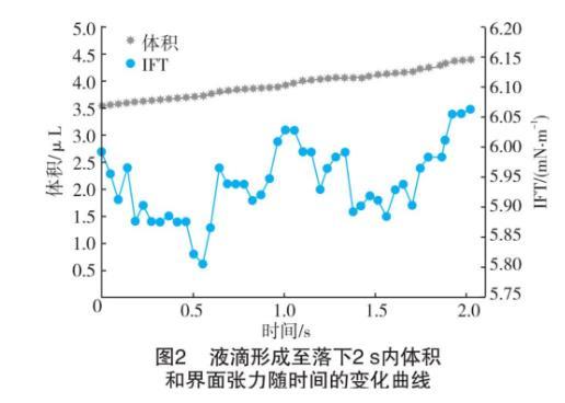 圖2為40℃、6.5 MPa時(shí),液滴形成至落下的2 s內(nèi)液滴體積和測(cè)得的界面張力隨時(shí)間的變化。由圖2可看出,在落下過程中體積逐漸變大,界面張力誤差在0.3 mN/m之內(nèi),雖然浮動(dòng)不是很大,但任取一點(diǎn)不能較好地體現(xiàn)整體。因此,選擇在懸滴完全形成開始計(jì)算,到完全落下以幀為間隔,因?yàn)橐旱瓮耆纬蓵r(shí)可以較清晰地得到液滴的最大曲率半徑,批量計(jì)算這段時(shí)間內(nèi)的界面張力值,最后得到其平均值。為避免液滴的隨機(jī)性,在每種環(huán)境下選取3個(gè)連續(xù)滴落的液滴的平均界面張力值作為最終結(jié)果。減少了實(shí)驗(yàn)的偶然性,使得到的結(jié)果更加可信。