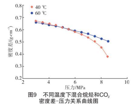 從混合烷烴密度-壓力曲線(見圖8)來看,整個(gè)測(cè)試壓力區(qū)間內(nèi)溫度對(duì)混合烷烴的密度影響不大,因此液體密度也不會(huì)造成界面張力的較大變化。從CO2密度-壓力曲線(見圖7)來看,溫度在中高壓下對(duì)CO2密度的影響較大。尤其是在3.5 MPa之后,60℃下的氣體密度隨著壓力升高速率明顯高于40℃時(shí)的速率。在同一壓力下,氣體密度隨著溫度升高顯著降低。密度較低的CO2氣體分子分布越稀疏,與烷烴液面直接接觸的氣體分子越少,故降低了二者發(fā)生萃取和混溶的概率,間接地導(dǎo)致液體的界面張力值增加。
