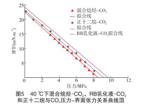 假設(shè)RB乳化液-原油不考慮斜率變化部分,始終以低壓階段(小于6 MPa)的斜率表示界面張力的變化。將表中同一溫度下不同系統(tǒng)的關(guān)系式展現(xiàn)在曲線圖上(見圖5和圖6)。從圖5和圖6可知,不論在哪個(gè)溫度下,混合烷烴和RB乳化液的壓力-界面張力曲線都接近平行,即兩種油的界面張力隨著壓力的升高幾乎以同樣的速度降低。計(jì)算得知,40℃和60℃下實(shí)驗(yàn)混合烷烴和RB原油的壓力-界面張力關(guān)系式中的斜率誤差為6.0%和8.6%??v觀兩種油的組成發(fā)現(xiàn),本實(shí)驗(yàn)所使用的混合烷烴中正十二烷的摩爾分?jǐn)?shù)達(dá)71.07%,而RB原油中的C12+的摩爾分?jǐn)?shù)達(dá)到57.66%。也就是說,混合烷烴和原油的組分中占主導(dǎo)作用的是高碳數(shù)的正構(gòu)烷烴。據(jù)姬澤敏等的大量實(shí)驗(yàn)研究,界面張力在不同的正構(gòu)烷烴-CO2體系中具有極好的規(guī)律性,在相同的溫度壓力條件下,正構(gòu)烷烴的碳數(shù)和界面張力成正比關(guān)系。從文獻(xiàn)中RB原油組成分析得知,C12+的分子量高達(dá)366 g/mol,而本實(shí)驗(yàn)中的混合烷烴的分子量?jī)H為156.74 g/mol。由此得知,實(shí)驗(yàn)誤差的主要來源是高碳正構(gòu)烷烴的組成不同。