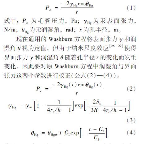 式中:Pc為毛管壓力,Pa;γHg為汞表面張力,N/m;θHg為汞潤濕角,rad;r為孔半徑,m;γ∞為孔半徑無窮大時(shí)汞的表面張力,γ∞=480 mN/m;θHg∞為孔半徑無窮大時(shí)汞的潤濕角(θHg∞=140°);Sb為吸附熱,Sb=Eo/Tb=93.99 J/(mol·k),Eo為蒸發(fā)焓,Tb為沸點(diǎn);R為理想氣體常數(shù),R=8.314 J/(mol·k);h為有效分子或原子直徑,h=0.302 nm;rc為液滴曲率半徑,rc=-r/cosθ,nm;常數(shù)C1、C2、C3分別為18.345、1.719、2.711 7。