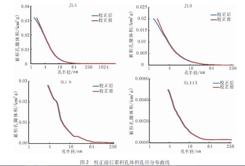 同樣應(yīng)用參數(shù)校正前后的Washburn方程對松遼盆地青山口組JL-1、JL-3、SL1-9、SL1-13井的泥頁巖樣品的數(shù)據(jù)處理、對比發(fā)現(xiàn)——參數(shù)校正后的方程對于半徑為4 nm以下的孔有較大的影響,對于半徑為4 nm以上的孔基本上沒有影響(圖3)。