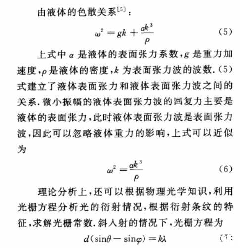 表面張力系數(shù)是液體的一個(gè)重要參量,測(cè)量液體表面張力的方法有吊環(huán)法、拉脫法等,這些都是基于力學(xué)平衡來(lái)測(cè)量液體的表面張力。光學(xué)測(cè)量技術(shù)具有快速、無(wú)損等特點(diǎn),所以自激光器發(fā)明以來(lái),光學(xué)測(cè)量技術(shù)廣泛應(yīng)用于各種物理參量的測(cè)量,陜西師范大學(xué)苗潤(rùn)才教授用激光干涉法測(cè)量液體的表面張力系數(shù),實(shí)現(xiàn)了液體表面張力系數(shù)的光學(xué)測(cè)量,并首次觀察到穩(wěn)定的液體表面張力波的激光衍射現(xiàn)象。我們嘗試用激光衍射法測(cè)量了液體表面張力系數(shù),實(shí)驗(yàn)采集了清晰、穩(wěn)定的液體表面張力波的激光衍射圖樣,建立一種液體的表面張力系數(shù)測(cè)量的光學(xué)測(cè)量方法,此方法具有非接觸、無(wú)損的特點(diǎn)。