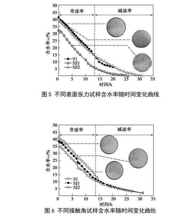 把篩好的土放入105℃烘箱內(nèi)烘至恒重備用。設(shè)計土樣的干密度為1.5 g/cm3,含水率計算不考慮酒精溶液和肥皂水引起的液體密度變化,制樣含水率為16%~18%。采用輕型擊實儀制圓柱試樣,試樣直徑為102 mm,高40 mm,試樣制好后用真空飽和法進行飽和,其中,SZ1樣用20%酒精溶液飽和,SZ2樣用濃度為2 g/L的肥皂水飽和,其余試樣均為純水飽和,抽氣時間為6 h,試樣在真空下的浸泡時間為12 h。為縮短試樣的脫濕時間以減小酒精揮發(fā)造成的濃度降低,飽和試樣脫濕采用低溫烘干法,烘箱的溫度控制在50℃(小于酒精的沸點和十八胺的熔點),當2h內(nèi)試樣的質(zhì)量變化量不超過2 g時停止試驗。試驗開始后,前8 h每隔30 min把試樣從烘箱中取出后先稱重,隨后進行拍照記錄,稱重和拍照的時間控制在30s內(nèi),拍照結(jié)束后把試樣放入烘箱繼續(xù)脫濕,6 h以后拍照間隔時間增加為1 h。2試驗結(jié)果2.1水分蒸發(fā)與臨界含水率圖5給出了不同表面張力的3種試樣含水率隨時間變化的關(guān)系曲線。