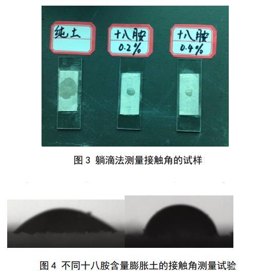 目前測量粉體接觸角(包括土顆粒)的方法主要有3種:躺滴法、毛細管上升法和Wilhelmy平板法,其中,躺滴法測出的接觸角為介于前進接觸角和后退接觸角之間的表觀接觸角,毛細管上升法測出的接觸角為前進接觸角,Wilhelmy平板法測出的接觸角為前進接觸角或后退接觸角。土體開裂是一個相對較慢的過程,因此土顆粒與孔隙水的接觸角大部分時間應(yīng)該處于前進接觸和后退接觸角之間的某一表觀接觸角。所以,本文采用躺滴法對土顆粒接觸角進行測量。土樣烘干后過0.075 mm的篩,取長度為4 cm左右的雙面膠帶貼到載玻片上,將篩好的土顆粒均勻覆蓋載玻片,并用重量為200 g的砝碼壓住載玻片,持續(xù)時間為2 min,移開砝碼后反復(fù)輕輕磕碰載玻片以去除多余的土顆粒,直到膠帶表面覆蓋有一層薄薄的土顆粒,且土顆粒分布均勻無明顯凸起。如圖3所示,當水滴滴到被純土覆蓋的膠帶上時,液滴迅速擴散開,此時土顆粒的親水性很好,接觸角趨近于0。水滴滴到另外兩個覆蓋著混有十八胺土樣的載玻片時,形成了小液滴,此時固–液界面和氣–液界面之間的夾角不為0,把這2塊載玻片分別放到試驗臺上進行液滴在土顆粒表面的表觀接觸角測量,液滴初始體積為5μL,測量儀器為JC2000型接觸角測量儀,如圖4所示,每個土樣的接觸角反復(fù)測量5次后取平均值。十八胺含量為0.2%土樣的接觸角為30.5°,十八胺含量為0.4%土樣的接觸角為60.2°。