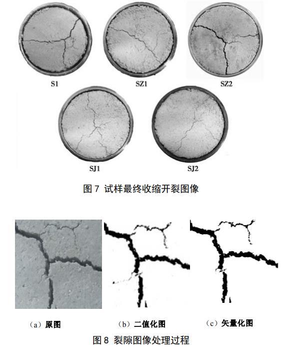 圖7給出了5個試樣在脫濕結(jié)束后對應(yīng)的收縮開裂圖像。從圖中可以看出,每個試樣均出現(xiàn)了不同程度的收縮裂隙,各試樣表面裂隙最終形態(tài)具有大致相似的規(guī)律:3條裂隙相交于一點,把圓形表面分成了3個部分,S1樣和SZ2樣的裂隙較寬,試樣開裂明顯,其余試樣裂隙發(fā)育不明顯,裂隙在形成過程中先形成一條主裂隙,主裂隙發(fā)育過程中支裂隙開始發(fā)育,最終支裂隙和主裂隙相交形成3條裂隙。S1樣和SZ1樣不僅出現(xiàn)了裂隙,在試樣和鋼環(huán)接觸的地方還出現(xiàn)了明顯的分離,試樣出現(xiàn)了體縮,其余試樣也出現(xiàn)了不同程度的體縮,但并不明顯。為得到試樣的裂隙度,先要對采集到的試驗開裂圖片進行圖像處理,如圖8所示,先對采集到的膨脹土干縮過程圖像進行二值化,去除一些非裂隙雜點,再把二值化圖像進行矢量化,矢量化后的圖像通過AUTOCAD提取試樣收縮面積和裂隙面積,最后計算出試樣的收縮開裂裂隙度: