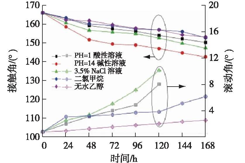 由圖4可知,超疏涂層在無水乙醇和二氯甲烷中浸泡168 h后仍然保持超疏水性能;在pH=1的酸性溶液和質(zhì)量分?jǐn)?shù)3.5%的NaCl溶液中浸泡120 h后與水仍然保持超疏性能。但在pH=14的堿性溶液中浸泡48 h后接觸角低于150°且已無法滾動(dòng)。這說明涂層具有較好的耐酸、耐鹽水和耐溶劑性能,但是耐堿性欠佳。