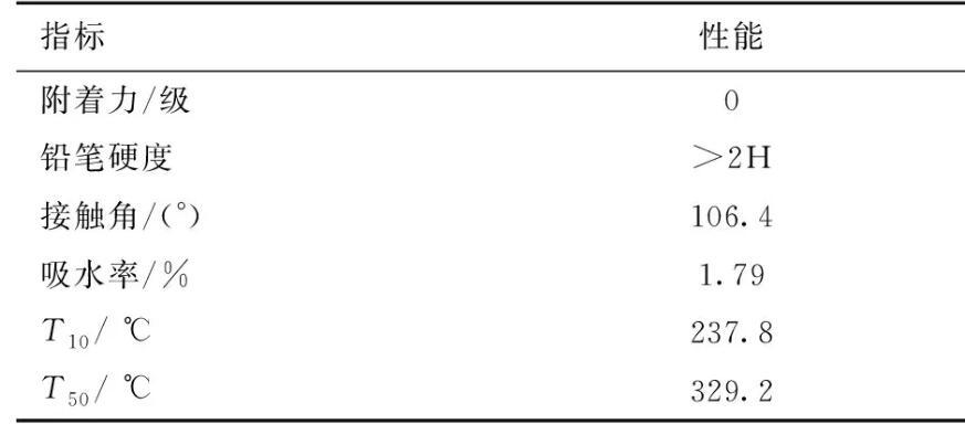 由表1可見,含氟聚氨酯固化膜和玻璃基材之間的附著力達(dá)到0級(jí),鉛筆硬度大于2H。FPU薄膜與水的靜態(tài)接觸角為106.4°,遠(yuǎn)高于不含氟的聚氨酯膜。本研究的FPU薄膜在浸泡24 h后吸水率趨于平衡,泡水200 h后吸水率不高于1.79%,遠(yuǎn)低于一般的聚氨酯的5%吸水率。歸因于C—F鏈段具有很低的表面張力,會(huì)自發(fā)地向表面遷移并富集,降低了表面張力,提高了材料的憎水性。除此之外,從表1中還可知FPU的T10和T50分別為237.8和329.2℃。與一般聚氨酯材料相比,F(xiàn)PU的熱穩(wěn)定性沒有很大程度的提升。