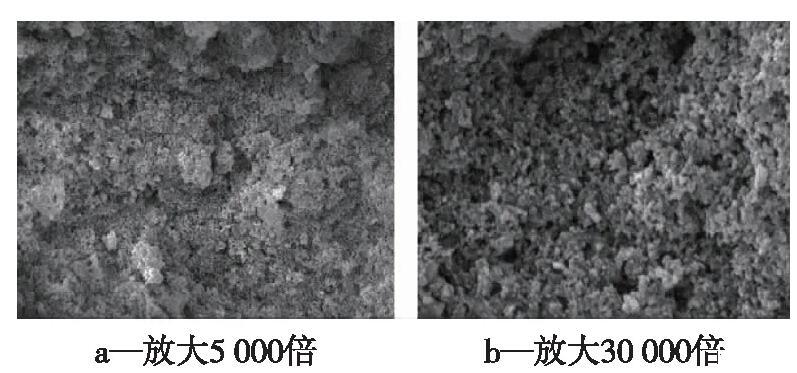 圖2a中能夠清楚地觀察到表面有1~2μm的凸起和200~300 nm的孔隙。圖2b是局部放大圖,明顯看出在涂層表面具有納米級(jí)的凹凸結(jié)構(gòu),且涂層表面分布有大量不均勻的粗糙孔結(jié)構(gòu)。許多小孔分布在這些凸起之間,小凸起與小孔共同形成珊瑚狀結(jié)構(gòu),導(dǎo)致更多的空氣被捕獲到這些孔隙中。