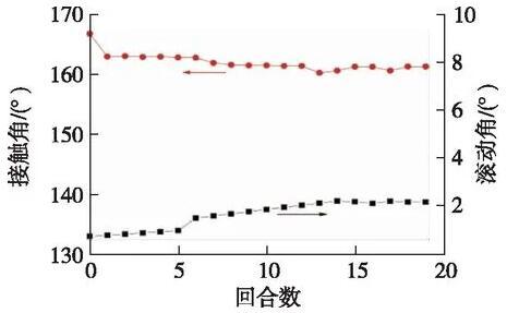 圖5為超疏涂層在經(jīng)過19次磨損的每次磨損周期后對(duì)水的接觸角和滾動(dòng)角變化情況。
