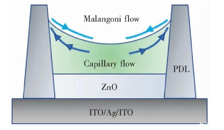 量子點的成膜形貌與墨水配方密切相關(guān)。與平面上成膜容易產(chǎn)生咖啡環(huán)類似,在像素結(jié)構(gòu)中量子點容易形成邊緣堆積的薄膜形貌。為了使量子點從邊緣遷移到像素坑中心,需要增大液滴內(nèi)部自外而內(nèi)的馬蘭戈尼流。