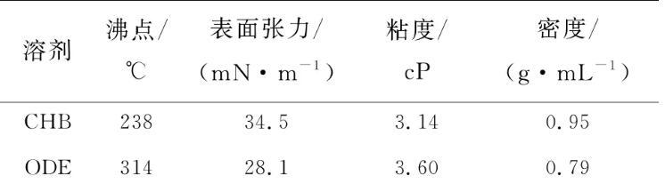 表1為CHB和ODE的沸點、表面張力等物理參數(shù),在選擇量子點溶劑時,利用了雙溶劑體系增強馬蘭戈尼流的基本原理。CHB是一種沸點較低、表面張力較高的溶劑,而ODE則是沸點高、表面張力低的溶劑,可以有效地增強自外而內(nèi)的馬蘭戈尼流;同時兩種溶劑的粘度都較低,并且對量子點都有較好的溶解性。