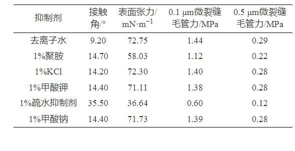 同時從表1中可以看出,疏水抑制劑能夠有效降低溶液的表面張力,當微裂縫的寬度為0.1μm時,微裂縫對于去離子水的毛管自吸力達到1.44 MPa,而加入疏水抑制劑后可以降低至0.60 MPa,而且隨著微裂縫寬度增加毛管自吸力逐漸降低。納米級別的微裂縫具有較高毛管自吸力,所以在體系構(gòu)建時應封隔頁巖微納米級裂縫和加入疏水類的處理劑,弱化微納米級裂縫的毛管自吸力。