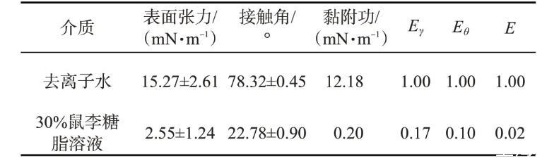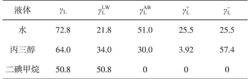 基于接觸角測量法中的LW-AB法,參考韓玉香等的研究,首先分別測試3種溶液(去離子水、丙三醇和二碘甲烷)在親油玻片及30%鼠李糖脂溶液處理后的親油表面的接觸角;然后結(jié)合3種溶液的表面張力及其分量值(表1),按照參考文獻中式1-38至式1-42,分別測算固體的表面能中Lifshits-van der waals分量、以及Lewis酸分量和堿分量;最后按照參考文獻中式1-37計算親油玻片及30%鼠李糖脂溶液處理后的親油表面自由能γS。