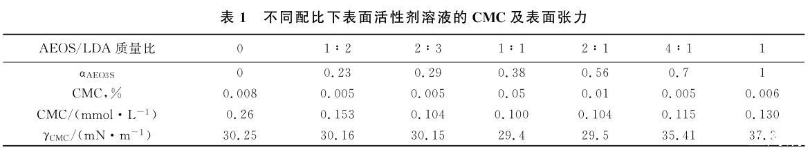 在25℃測試了AEO3S和烷醇酰胺LDA表面活性劑及其在不同質(zhì)量配比下溶液的表面張力,實驗結(jié)果見圖1。根據(jù)相對分子質(zhì)量計算出表面活性劑AEO3S的摩爾分?jǐn)?shù)(αAEO3S)。由圖1中濃度與表面張力的關(guān)系得到溶液的CMC及對應(yīng)濃度下的表面張力,實驗結(jié)果見表1。