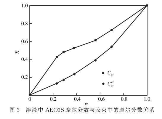 圖3溶液中AEO3S摩爾分數(shù)與膠束中的摩爾分數(shù)關(guān)系