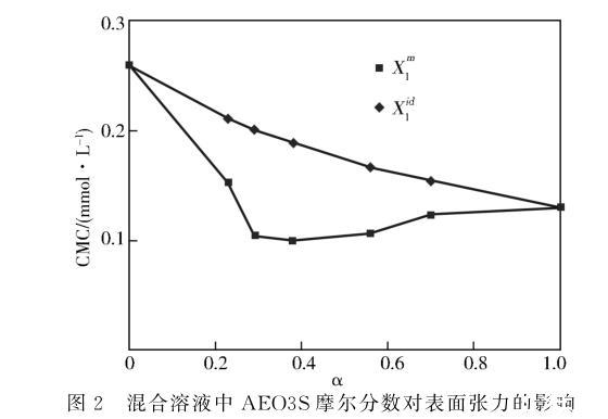 圖2混合溶液中AEO3S摩爾分數(shù)對表面張力的影響