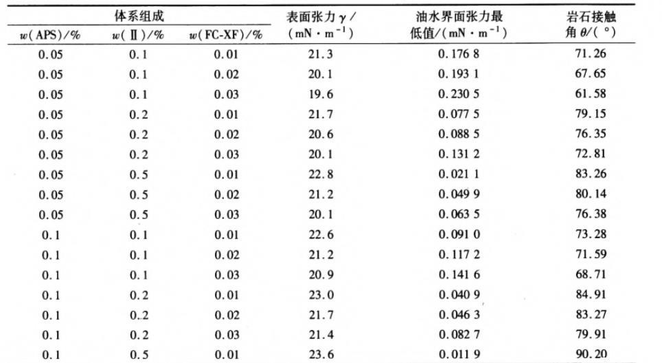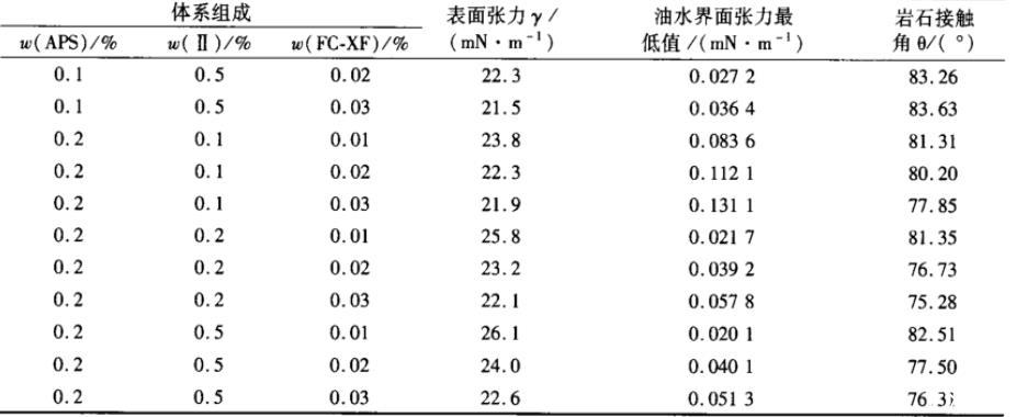 表1體系組成和含量對(duì)APS/Ⅱ/FC-XF混合體系界面性能的影響