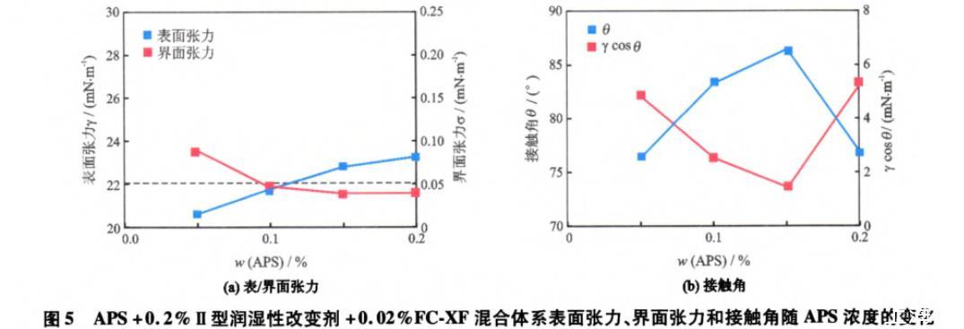 從圖5(a)中可以看出,隨著APS質(zhì)量分?jǐn)?shù)的增加,體系的表面張力增大,界面張力減小,這與FXCF對(duì)表/界面張力的影響機(jī)制相同。從圖5(b)中可以看出,隨著APS質(zhì)量分?jǐn)?shù)的增加,體系與巖石的接觸角先增加再減小,相應(yīng)的γcosθ先減小再增大,均出現(xiàn)極值點(diǎn),這與圖4(b)的變化趨勢(shì)不同。這是因?yàn)槲舰蛐蜐櫇裥愿淖儎┖虵C-XF使得巖石表面由水濕轉(zhuǎn)變?yōu)槿跤H水性潤濕(接觸角<75°),更易于吸附APS的親水頭基而使碳?xì)滏溤趲r石表面暴露,這降低了巖石表面的親水性,因而隨著APS質(zhì)量分?jǐn)?shù)的增加接觸角增大。但是,當(dāng)APS質(zhì)量分?jǐn)?shù)大于0.15%后,過多的APS分子可能在巖石表面發(fā)生雙分子層吸附或因競(jìng)爭吸附而降低Ⅱ型潤濕性改變劑的吸附量,使得巖石表面的親水性增加。而且,接觸角的變化決定了γcosθ的變化趨勢(shì),因而接觸角和γcosθ隨APS質(zhì)量分?jǐn)?shù)的變化曲線中均出現(xiàn)極值點(diǎn)。