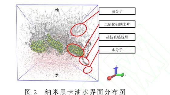采用SPC/E模型描述水分子間相互作用,該模型中由于H原子質(zhì)量小,對水分子間的H—H和H—O相互作用可忽略不計(jì)。選取C10H22為油相,原子間的相互作用勢采用CHARMM勢函數(shù)來描述。VA8模型在研究二硫化鉬結(jié)構(gòu)和振動特性時具有較高的準(zhǔn)確性,故選取其來描述納米片原子間的相互作用。以直鏈烷烴為改性劑改變納米片的親油親水性,采用CHARMM力場來描述原子間相互作用。采用6/12 Lennard-Jones(LJ)計(jì)算水分子、油相分子和納米黑卡之間的相互作用,截?cái)喟霃椒謩e為10?和12?。所構(gòu)建的油水界面體系由31 500個油分子和17693個水分子組成,并將納米黑卡置于所構(gòu)建的油水界面體系中。如圖2所示,油水界面上層部分的碳?xì)滏湵硎居头肿?,油水界面下層區(qū)域代表水分子。