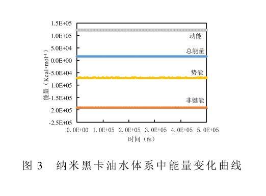 采用粒子-粒子-粒子-網格(PPPM)求解方法求解長程庫倫相互作用力。運用Polak-ribiere共軛梯度(CG)算法最小化能量,消除構型重疊。系統(tǒng)溫度為298 K,壓力為1 atm,系統(tǒng)在等溫-等壓系綜(NPT)下進行弛豫,對體系進行壓縮,使模型達到實際密度狀態(tài)。使用Nosé-hoover恒溫器控制體系溫度,時間步長1 fs,運行1 ns。然后保持系統(tǒng)體積不變,設置相同的時間步長和時間總長運行正則系綜(NVT)來穩(wěn)定體系,以確保體系的密度不變。最后,收集體系平衡后0.5 ns范圍內的數據,得到統(tǒng)計平均值。應該注意的是,在每個階段運行更長時間并不會對模擬結果產生明顯的變化。模擬中水相和油相的平均密度分別為(0.989±0.008)和(0.728±0.002)g/cm3,近似實驗值(溫度為298 K、壓力為1 atm時,水和C10H22的密度分別為:0.997和0.730 g/cm3)。模擬結束后,單片納米黑卡在油水界面體系中的能量變化如圖3所示,其他體系能量變化亦有此規(guī)律。