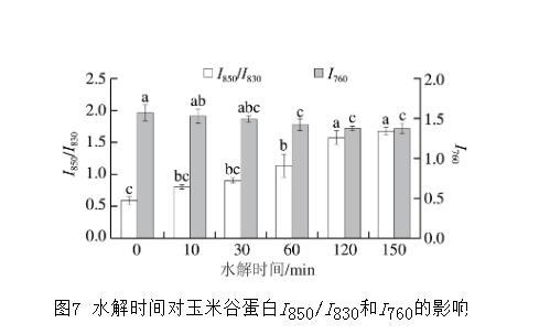 圖7水解時(shí)間對玉米谷蛋白I850/I830和I760的影響