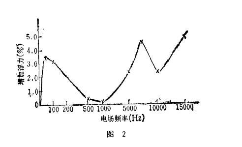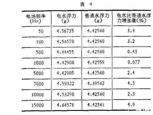 實驗用的振蕩穩(wěn)壓源是上海華東電子儀器廠制造的,輸出功率75W,該電源的電壓在實驗時保持300V、600V和700V三個數(shù)值。改變頻率從0到15kHz,水流過電場的速度為0.16m/s,水溫12.0±0.3℃,用長春市自來水和地下深井水。電水形成后20分鐘開始測浮力。測試時間為1984年10月18日到1984年10月21日,重復性實驗進行六次,曲線都帶有極值。表4是在電壓600V下的一組數(shù)據(jù)。
