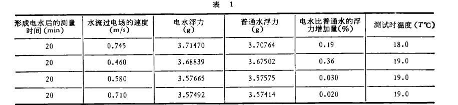 用自制電水器形成電水,用精度為0.1mg的電光天平測定電水和普通水的浮力。實驗用水是長春市自來水和深井水,測試時只要保證水溫和環(huán)境溫度穩(wěn)定,數(shù)百次實驗證實,電水浮力比普通水浮力增加,重復性規(guī)律較好?,F(xiàn)選四組數(shù)據(jù)列于表1。