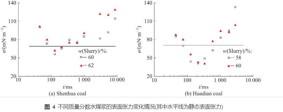 不同質(zhì)量分?jǐn)?shù)水煤漿表面張力的變化情況如圖4所示??梢钥闯觯翰煌瑮l件下水煤漿的動(dòng)態(tài)表面張力變化情況比較一致,隨著特征氣泡時(shí)間(t)的增加,動(dòng)態(tài)表面張力均先減小后增加,在氣泡特征時(shí)間為200 ms附近出現(xiàn)最小值;而水煤漿的動(dòng)態(tài)表面張力與靜態(tài)表面張力存在顯著差異,在氣泡特征時(shí)間較小或較大時(shí),動(dòng)態(tài)表面張力均大于靜態(tài)表面張力。