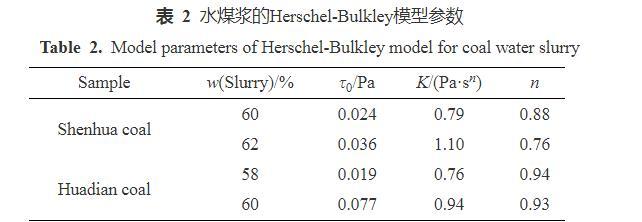 式中:是水煤漿黏度(Pa·s),為屈服應(yīng)力(Pa),為剪切速率(s?1),K為稠度系數(shù)(Pa·sn),n為流變指數(shù)。擬合關(guān)系式相關(guān)系數(shù)為0.98,擬合參數(shù)見表2。