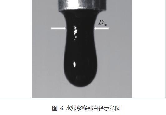 與純液體不同,由于漿體液固混合物流變性和屈服應(yīng)力等參數(shù)的影響,漿體破裂過程更加復(fù)雜。在漿體破裂末期,當(dāng)水煤漿液橋的喉部直徑(Dm,如圖6所示)尺寸很小時(shí),固體顆粒將會發(fā)揮顯著影響。典型水煤漿破裂實(shí)驗(yàn)照片如圖7所示,由于微觀破裂條件下液固出現(xiàn)部分分離,煤粉顆粒在液橋喉部附近凸出氣液界面,使得原本光滑的水煤漿表面逐漸粗糙,其變化特性與水煤漿黏度、表面張力和屈服應(yīng)力等參數(shù)密切相關(guān)。