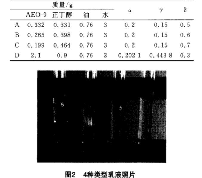 由圖1可見,在所配制的乳液中,既有均相乳液,也有兩相(上相、下相)乳液,同時有三相(中相)乳液。在選擇典型體系時,應體現(xiàn)出全面性,即以上4種類型乳液都涉及到,同時應考慮到漸變性,即固定某個變量(此處固定γ),一種相態(tài)向另一種相態(tài)轉(zhuǎn)變。由此,選出其中4組:A(下相乳液)、B(中相乳液)、C(上相乳液)、D(均相乳液),A、B、C、D的組成如表1所示,形成的乳液照片如圖2所示。分別將乳液部分分離出來,稀釋成質(zhì)量分數(shù)為0.1%、0.3%、0.5%、1.0%的微乳液。