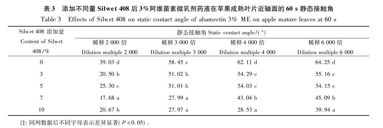 添加Silwet408可顯著改變3%阿維菌素微乳劑藥液在蘋果成熟葉片近軸面的靜態(tài)接觸角。其中,稀釋2000~4000倍時(shí),添加Silwet408后阿維菌素微乳劑藥液在成熟葉片近軸面的靜態(tài)接觸角在17.68~55.16°之間,均顯著低于未添加Silwet408時(shí)的靜態(tài)接觸角(39.03~64.25°)(表3)。與嫩葉相比,藥液在成熟葉片上的靜態(tài)接觸角更小,說明藥液更易潤(rùn)濕成熟葉片;同時(shí),與蘋果嫩葉上的變化規(guī)律相同,隨著藥液稀釋倍數(shù)增加,其靜態(tài)接觸角呈增大趨勢(shì)。