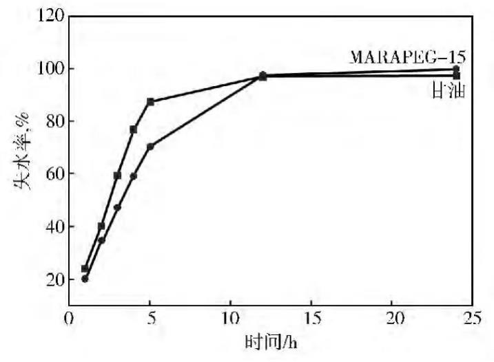 由圖3可以看出:MARAPEG-15的質(zhì)量隨時(shí)間增加不是十分明顯,說明Gemini非離子表面活性劑MARAPEG-15吸水性能不理想,而甘油質(zhì)量隨時(shí)間增加較明顯,表明吸濕性能不及甘油。由圖4可以看出:在前10h,MARAPEG-15的保濕性能比甘油略差,而24h后,MARAPEG-15的保濕性能與甘油基本相同。