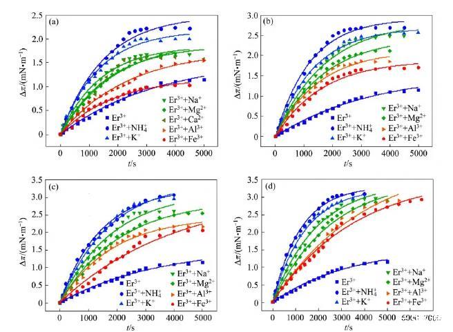本文根據(jù)離子型稀土礦原地浸礦液的成分組成,選擇NH4+、Na+、K+、Mg2+、Ca2+、Al3+、Fe3+等離子為共存陽離子的代表,Er3+離子作為鑭系重稀土的代表。采用LB膜技術(shù)測定不同種類陽離子與稀土Er3+離子共存時的P507 分子單層Δπ?t 曲線,研究水溶液中與稀土離子共存的不同種類陽離子的競爭擴散和吸附行為對稀土離子與P507 分子相互作用的影響規(guī)律。通過動態(tài)界面張力實驗表征、結(jié)合分子動力學模擬,解釋了共存陽離子競爭吸附影響稀土萃取分離選擇性的界面鹽效應及其作用機制。