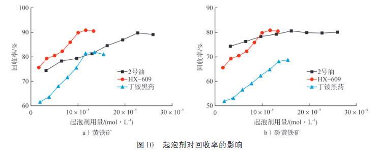 由圖10可知:在起泡劑用量相同條件下,HX-609在提升黃鐵礦回收率方面的效果顯著優(yōu)于另外兩種起泡劑。對于磁黃鐵礦而言,2號油與HX-609的浮選效果相當(dāng)。然而,從藥劑成本角度考量,2號油更具有優(yōu)勢。