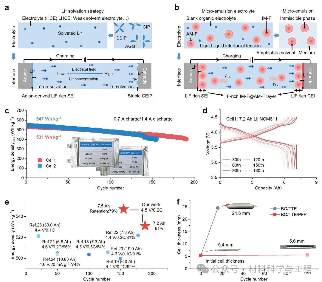 圖1(a)、(b)Li+在充電過程的傳輸行為及正負(fù)極界面演化示意圖,對應(yīng)Li+溶劑化策略(a)和微乳電解液策略(b);(c)Li||NCM811軟包電池在微乳電解液中的循環(huán)性能;(d)電池的電壓-容量曲線;(e)本文與報(bào)道的電池性能對比;(f)電池在循環(huán)前后的厚度變化