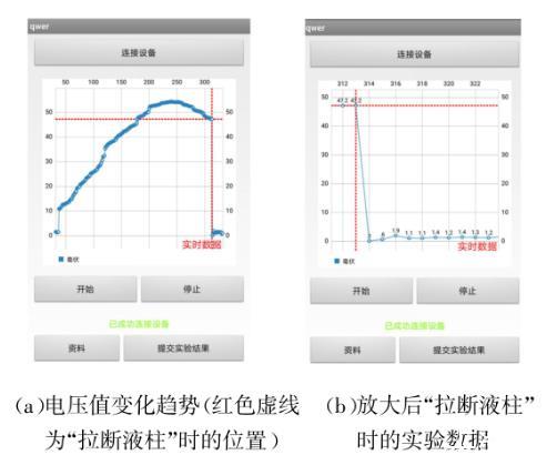 針對傳統(tǒng)實(shí)驗(yàn)?zāi)J街杏涗洈?shù)據(jù)的缺點(diǎn),在智能手機(jī)上開發(fā)了專門的實(shí)驗(yàn)軟件,通過手機(jī)的藍(lán)牙連接到實(shí)驗(yàn)儀器,將實(shí)驗(yàn)所采集到的所有電壓表讀數(shù)實(shí)時(shí)傳送到智能手機(jī)上,然后在智能手機(jī)上以坐標(biāo)點(diǎn)的形式描繪出電壓表讀數(shù)的變化,在智能手機(jī)端就可以觀察到金屬環(huán)與液面分離瞬間的數(shù)據(jù)變化,很方便地讀取到“拉斷液柱”瞬間的實(shí)驗(yàn)數(shù)據(jù)。