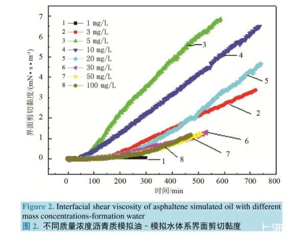 圖2.不同質(zhì)量濃度瀝青質(zhì)模擬油–模擬水體系界面剪切黏度