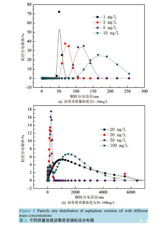 不同質(zhì)量濃度瀝青質(zhì)溶液界面張力、界面剪切黏度及粒徑分布圖【下】