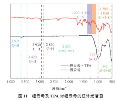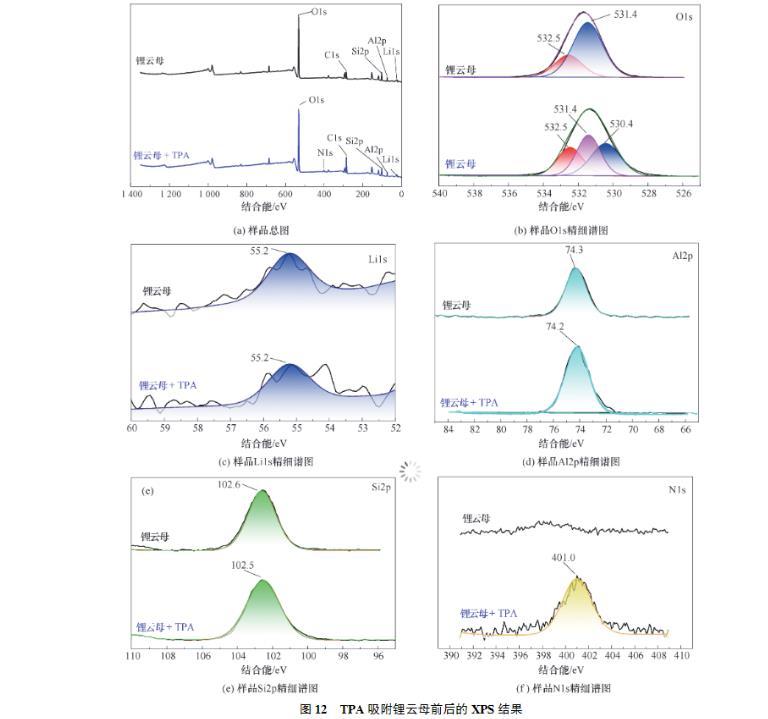 (2)接觸角試驗(yàn)表明,同等條件下,TPA作用鋰云母的接觸角總是大于DDA,展現(xiàn)了TPA更強(qiáng)的疏水性。Zeta電位測(cè)試結(jié)果表明,TPA及DDA在鋰云母表面的吸附為靜電吸附,并且碳鏈更長(zhǎng)的TPA由于疏水效應(yīng)吸附性更好,進(jìn)一步證明了TPA的強(qiáng)疏水性。FTIR及XPS進(jìn)一步證實(shí)了TPA吸附在鋰云母表面。