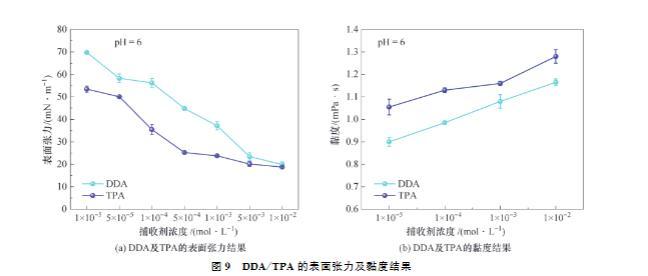 DDA及TPA的黏度結(jié)果如圖9(b)所示。由圖9(b)可知,弱酸性條件下,DDA或TPA的黏度均隨著捕收劑用量的增加而增大,這說明DDA或TPA均能增強(qiáng)溶液黏度。當(dāng)捕收劑濃度一致時(shí),TPA的黏度總是大于DDA,這說明較高黏度的TPA具有更穩(wěn)定
