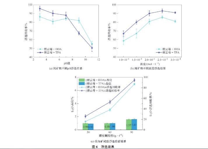 浮選測(cè)試結(jié)果如圖6所示。由圖6(a)可以看出,在酸性條件下,DDA及TPA對(duì)鋰云母的浮選回收率較高,而在堿性條件下浮選回收率均下降,如pH值為3時(shí),TPA對(duì)鋰云母浮選回收率可達(dá)95.62%,而在pH值為11時(shí)僅為50.60%。此外,酸性條件下TPA對(duì)鋰云母的浮選回收率高于DDA,如pH值為3時(shí),DDA、TPA對(duì)鋰云母浮選回收率分別為86.28%和95.62%。