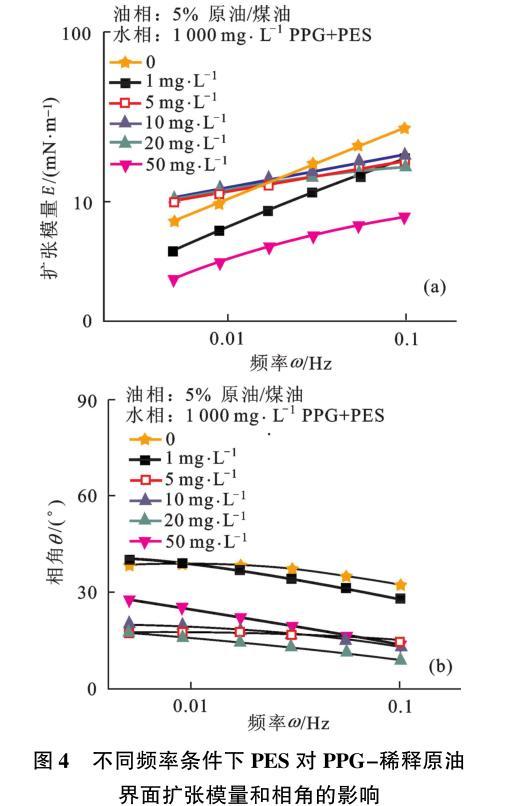 圖4不同頻率條件下PES對(duì)PPG-稀釋原油界面擴(kuò)張模量和相角的影響