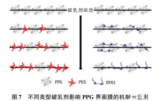 圖7不同類(lèi)型破乳劑影響PPG界面膜的機(jī)制示意圖
