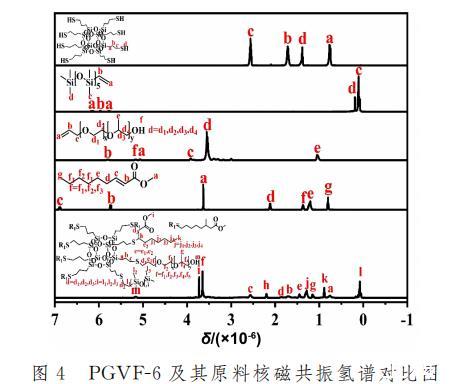 圖4為PGVF-6以及其原料的核磁共振對比圖。PGVF-6譜圖中,SH-POSS上的-SH質子氫吸收峰已經消失,接枝成功的APEG750單體,烯烴雙鍵的質子氫吸收峰已經消失,末端連接的-OH質子氫吸收峰在5.21times 10^{-6}處;同樣反應成功的2-壬烯酸甲酯單體,烯烴雙鍵的質子氫吸收峰也同樣消失不見,連接O的末端烷烴-CH3質子氫吸收峰處于3.72x10-6的位置,末端烷烴-CH3的質子氫吸收峰在0.88x10-6處;最后成功反應的VDMS單體,烯烴雙鍵的質子氫吸收峰也已經消失,后續(xù)Si上連接的所有甲基-CH3分別處在0.12x10-6和0.08x10-6處,可以得知PGVF-6雜化材料成功合成。